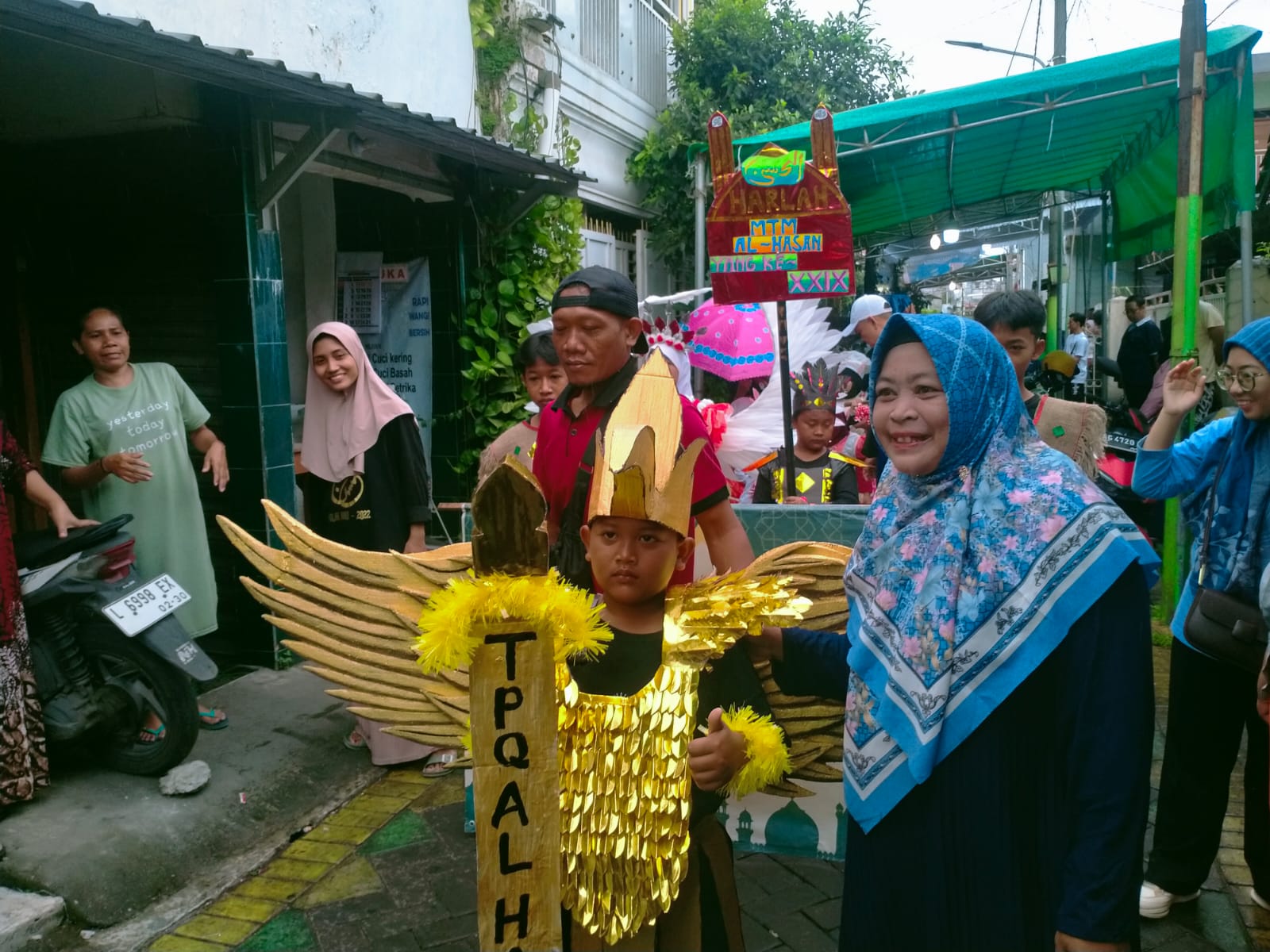 Ratusan santri TPQ Musholla Al-Hasan tampil penuh semangat mengenakan busana islami dan kostum adat bernuansa warna-warni. Sambil membawa bendera dan atribut keislaman, mereka melantunkan sholawat dengan penuh kegembiraan, menggema di sepanjang rute pawai dan menghidupkan nilai-nilai cinta kepada Rasulullah SAW.